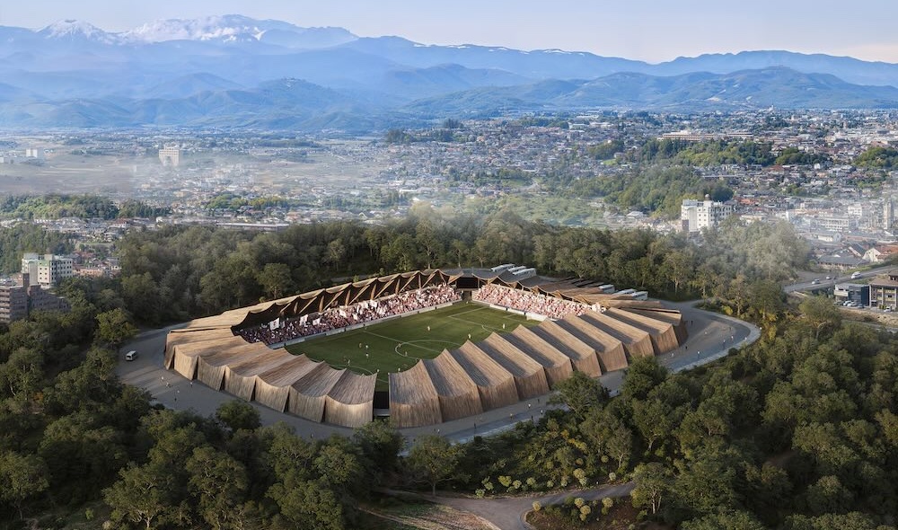 計画では、スタジアムの意匠設計を秋吉浩気氏が率いるVUILD(ヴィルド)と福島市を拠点とするボーダレス総合計画事務所(代表:鈴木勇人)が担当。さらに、構造・環境設計と構造設計およびスポーツ照明コンサルをエンジニアリング・コンサルティング会社のArup(アラップ)が手がけます。5,000席規模のスタジアム構想の実現化にあたり、VUILDが最初に重視したのは「小断面を周回させる」という考え方でした。同社の調べでは、小規模スタジアムでは拡張性を考慮し、メインスタンドに席数を集中させる計画が多く見られたとのこと。しかしそれはメガストラクチャーになりやすく、コスト高を招くと試算。よって本計画では、2階建て住宅規模の断面を1周させることで全体を構成。これによりコストを抑制しつつ、施工性を高め、人の手による建設が可能な「ヒューマンスケールのスタジアム」を実現できるとしています。