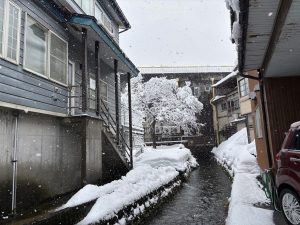 流雪溝は、自然の流水の運搬作用を利用して雪の塊を流して排雪するための施設。魚野市内至る所にあります。