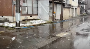 井戸から地下水をくみ上げて路面に散水することで、雪を融かします。降雪を感知して自動的に散水することができる。消雪パイプの発祥は長岡市と言われている。