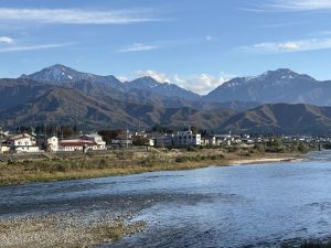 小出橋から見て右側から、八海山(1778m)・中ノ岳(2085m) ・越後駒ヶ岳(2003m)が見えます。三山あわせて越後三山只見国定公園に指定されている。「ハナコ」と覚えると覚えやすいそうです。