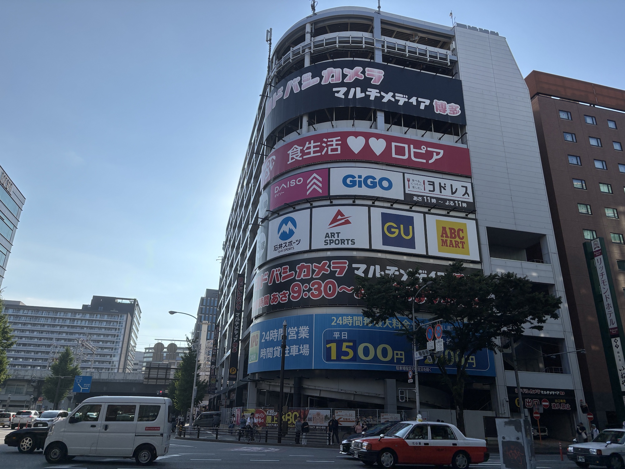 筑紫口(東側・新幹線側)を出て徒歩1分。家電だけでなく、4階には激安スーパー「ロピア」や飲食店街「ヨドバシ丁」が入り、地元客と観光客が入り混じるエネルギッシュな空間です。