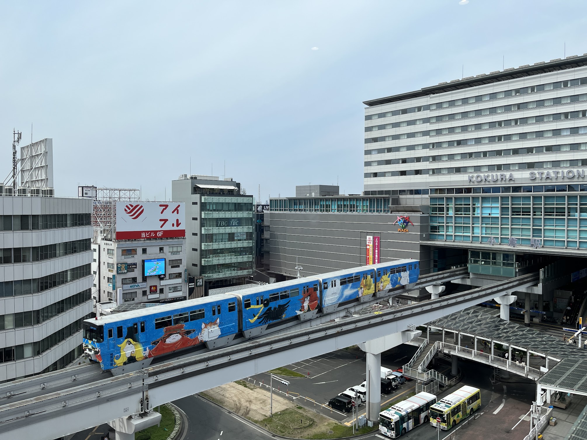 小倉駅の最大のシンボルといえば、駅ビルの中央に突き刺さるように発着する北九州モノレールです。