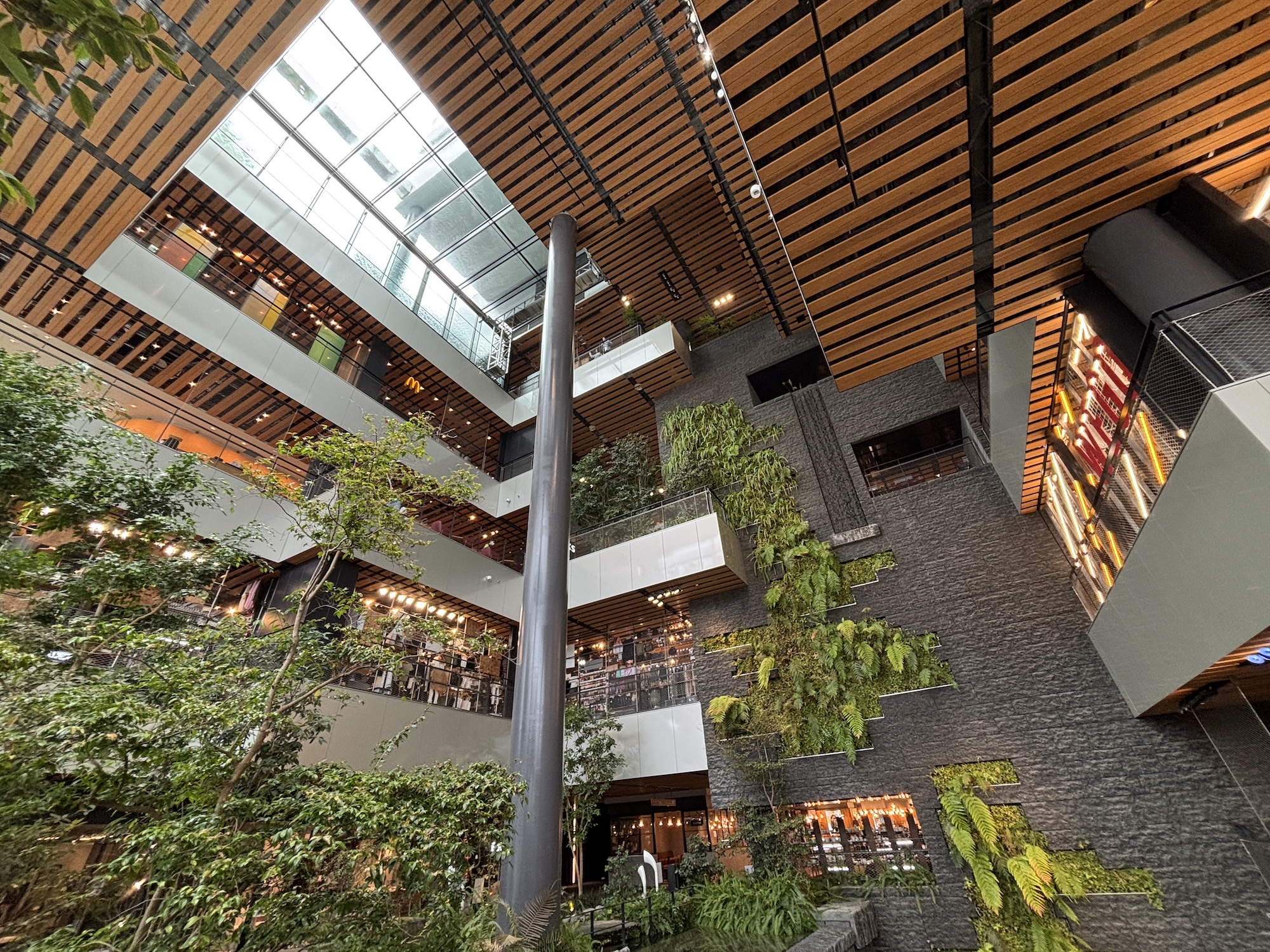 駅ビルの1階から7階までを貫く吹き抜けには、高さ約10メートルの「三滝」と、豊かな緑が茂る立体庭園「ぼうけんの山」が配置されています。建物の中にいながらにして、阿蘇の自然を感じられる設計は圧巻です。