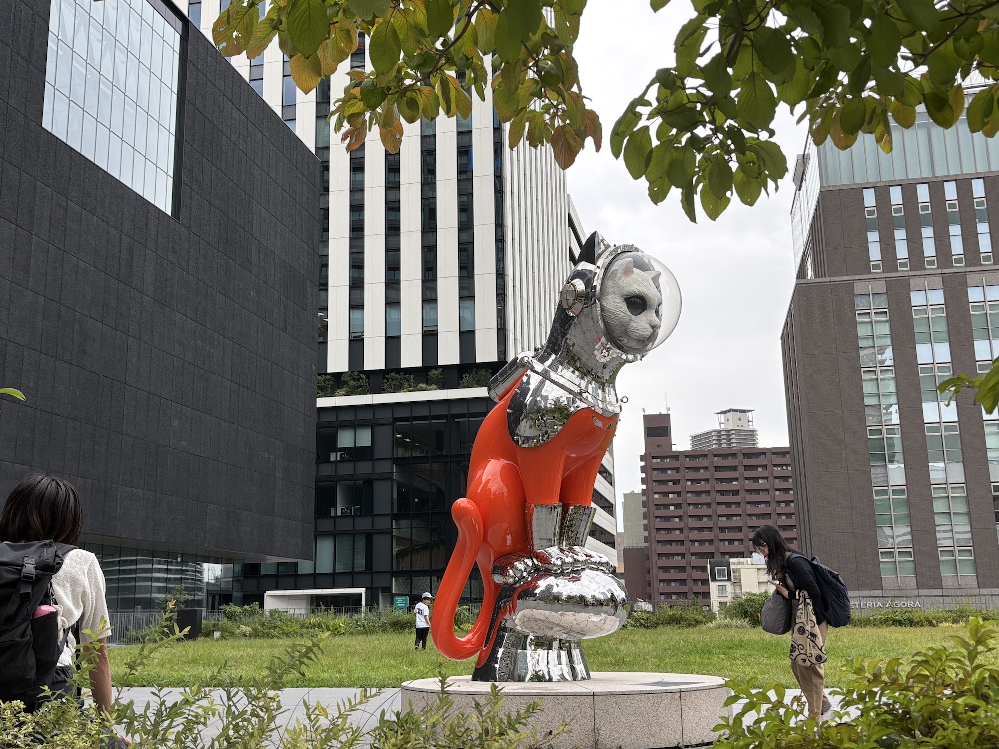 フォトスポット: 芝生広場に鎮座する、ヤノベケンジ氏の巨大彫刻『SHIP’S CAT (Muse)』。宇宙服を着た猫の姿は、いまや中之島の新しいシンボルとなっています。