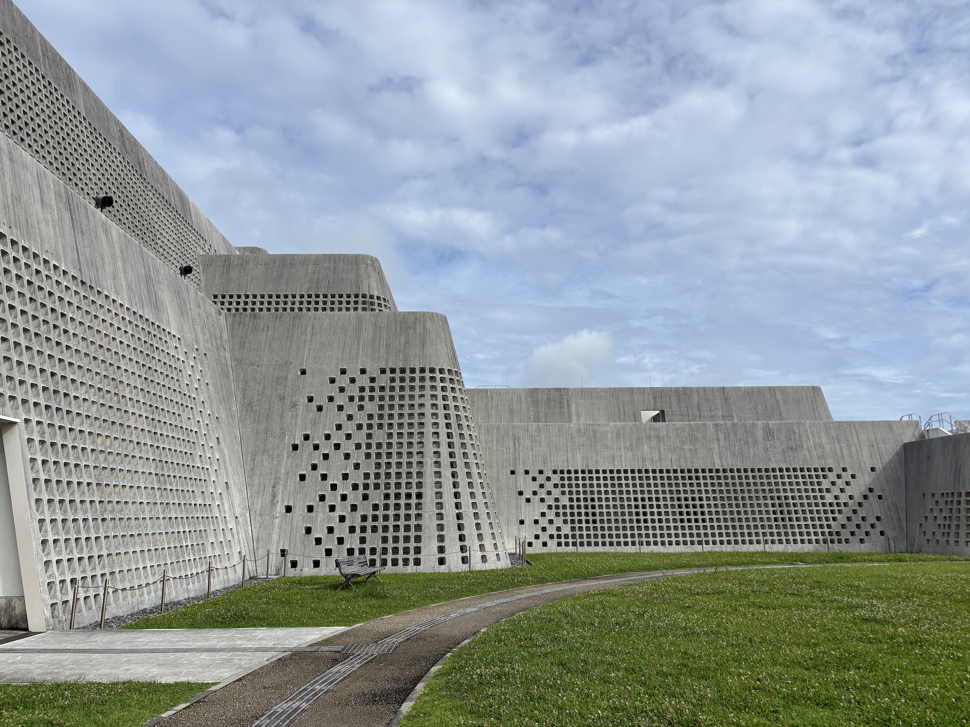 光と風を通す「花ブロック」の知恵 外壁をよく見ると、沖縄の建築でよく使われる「花ブロック」を連想させる幾何学的な穴が開いています。これは強い日差しを遮りつつ、光と風を内部に取り入れるための工夫。この壁が作り出す影のパターンを楽しみながら建物の周囲を歩くだけでも、素晴らしい散策体験になります。