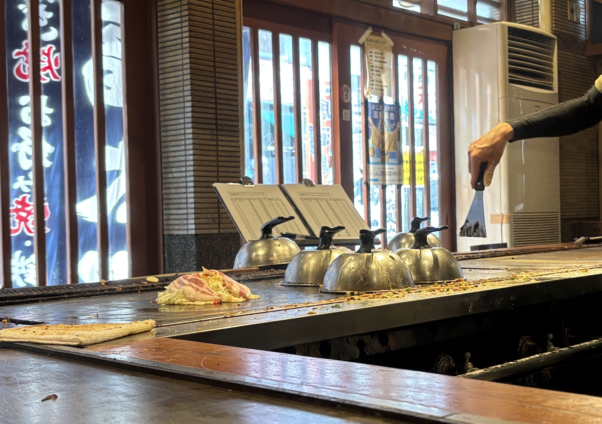 活気ある雰囲気を楽しむ: コの字型の鉄板カウンターは、職人の手さばきを間近で見られる特等席。待ち時間の疲れも、そのライブ感溢れる調理風景を見れば吹き飛んでしまうはずです。