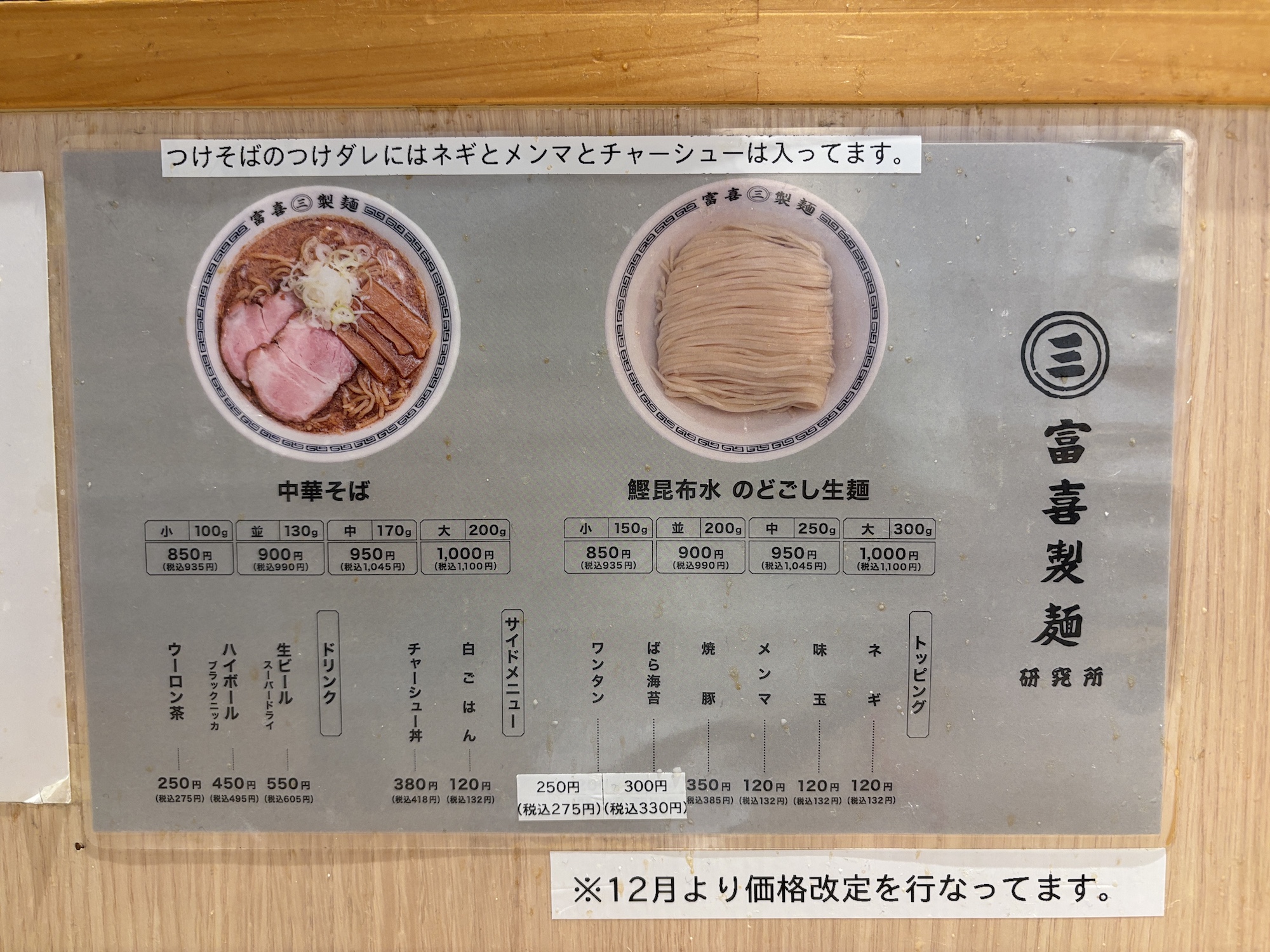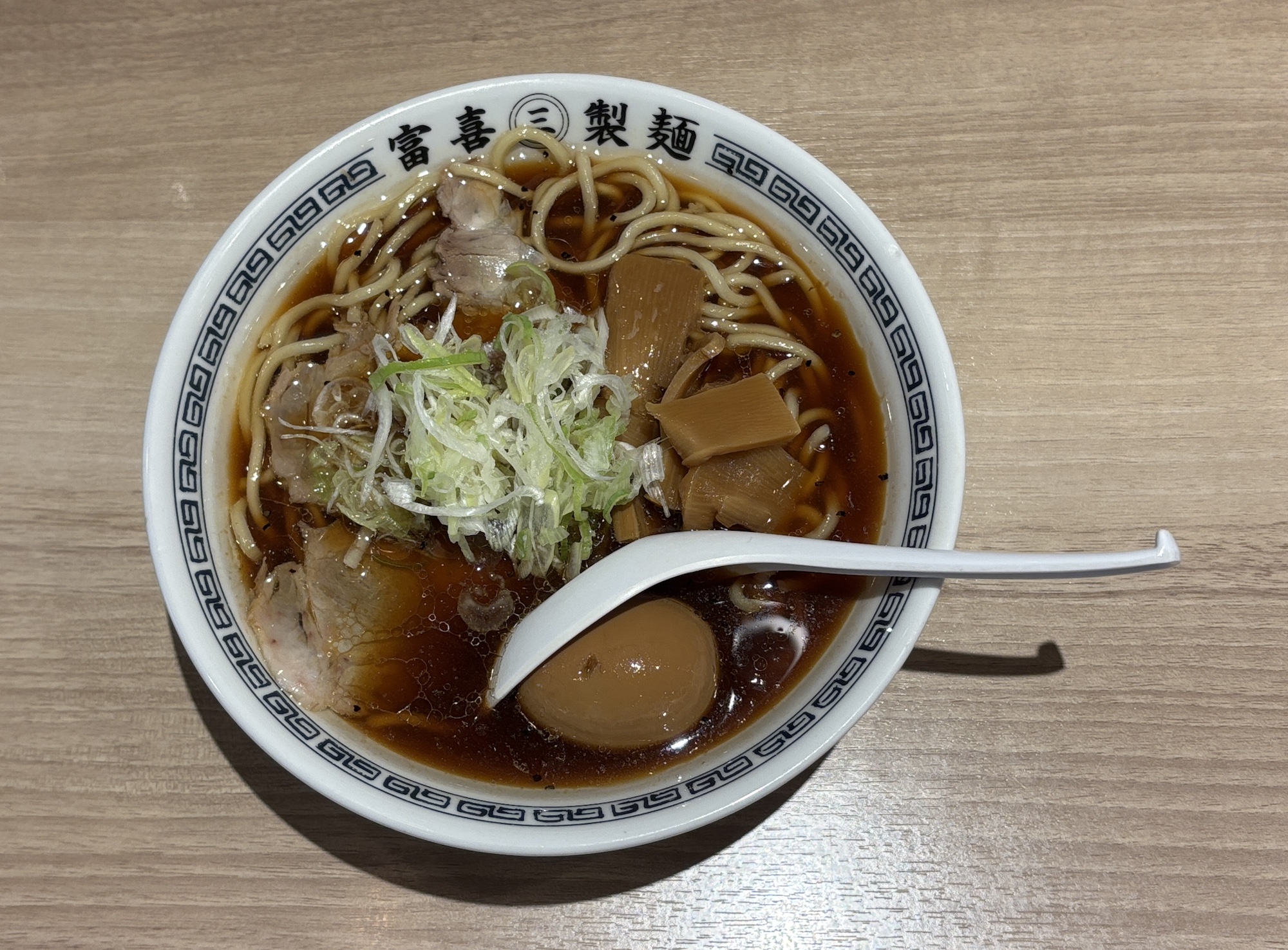 市内に数店舗ある富喜製麺研究所。つけ麺は以前別の店でいただいたので中華そばを。卓上にあるメニュー表に自分で書いて注文する。中華そばは平均点な感じ。中太麺とスープ。スープはいりこ出汁の風味を感じた。熊本ラーメンに飽きたら中華そばもいい。