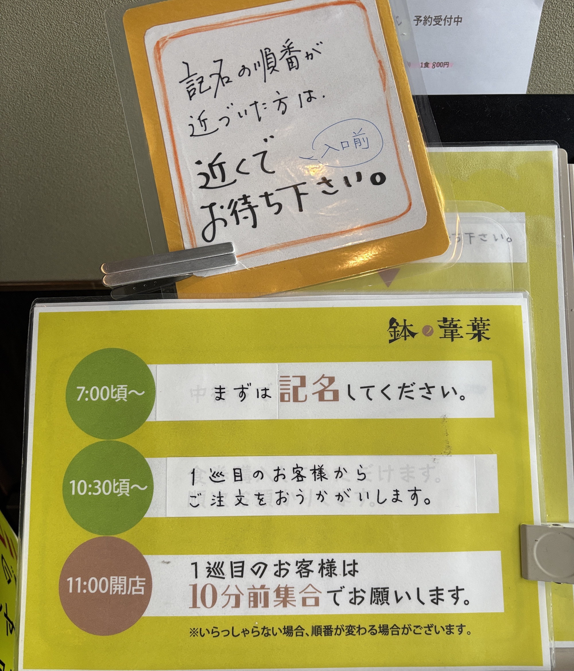 記帳台に名前を書き待機、店員さんに呼ばれたら食券を買って着席
