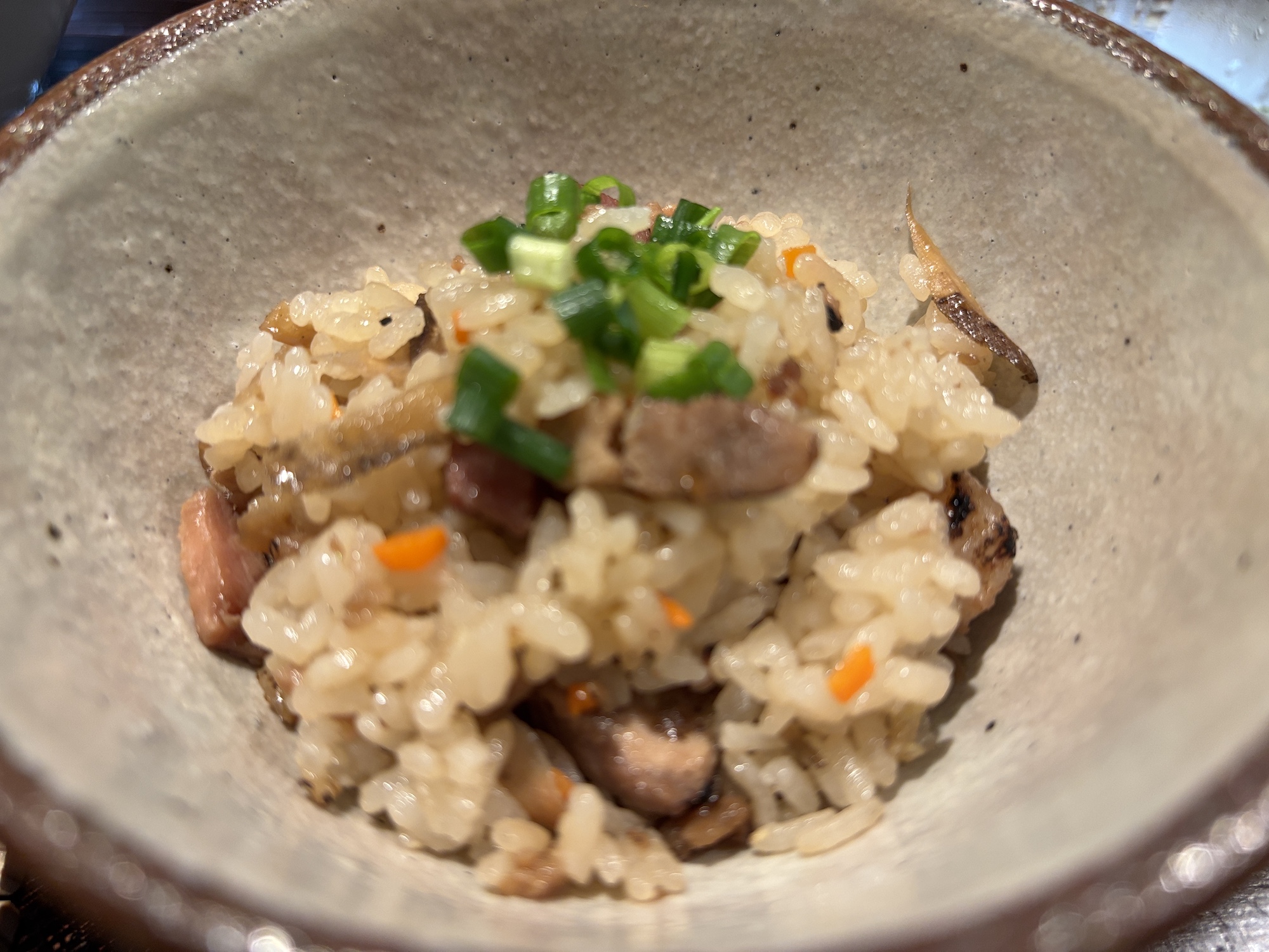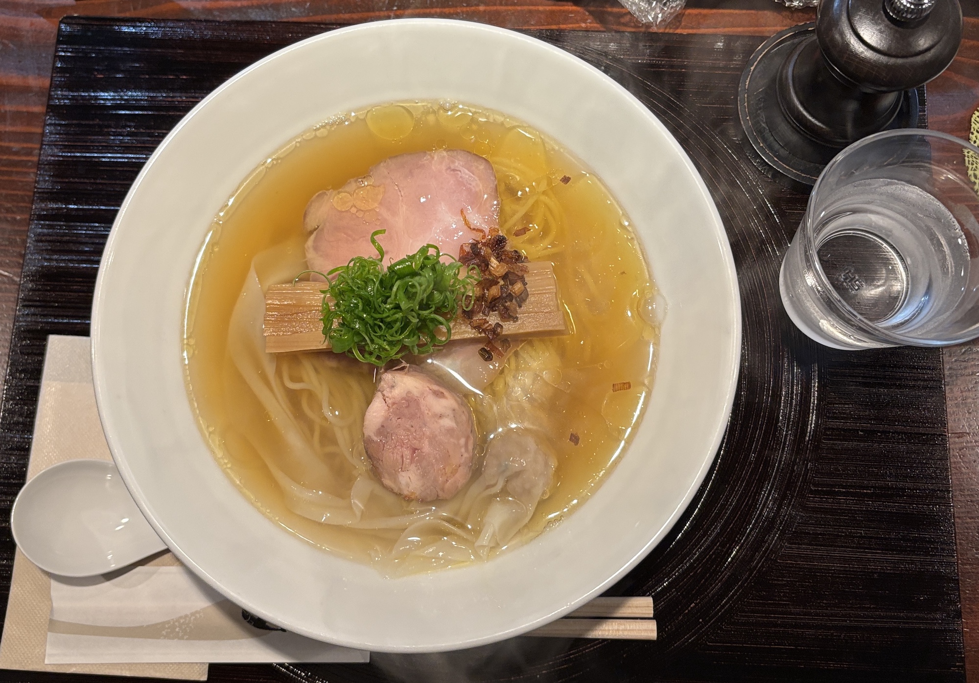 自家製麺とあっさりしたスープに焦がし玉ねぎ、九条ネギ、大きめのメンマ、分厚めのチャーシュー、鶏の粗挽きがトッピング。デフォルトの塩ラーメンでも十分なボリューム。ゴボウの炊き込みご飯も美味かった。ラーメン店で修行されず社食で働いて開業されたそう。接客も全体的に良かった。