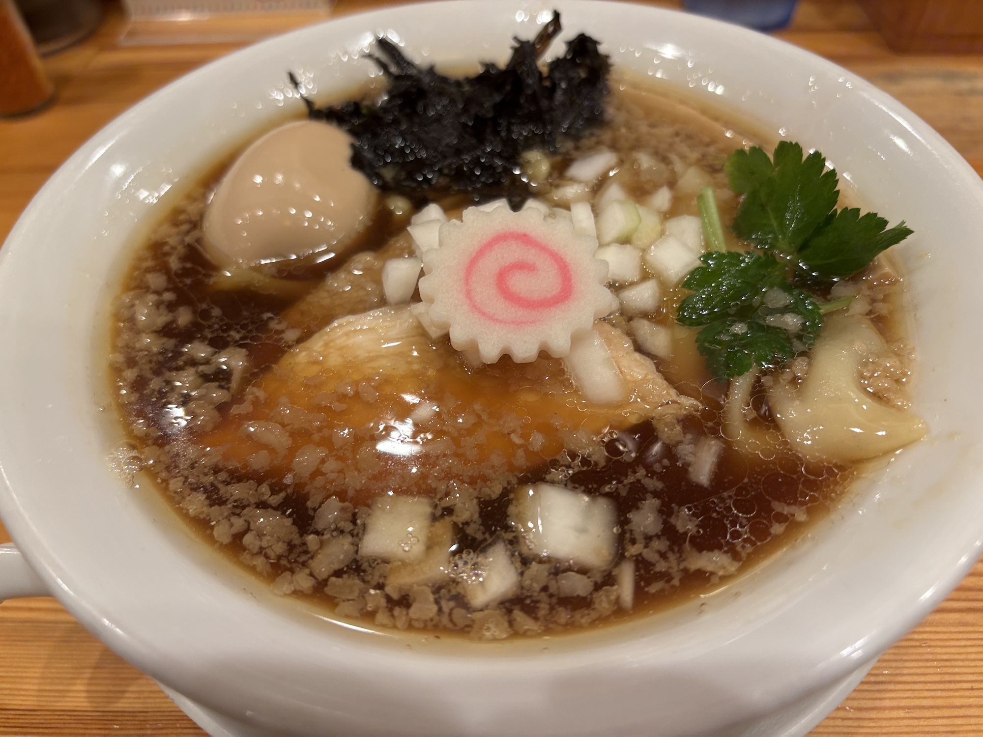 ムタヒロと言えば東京国分寺で数店舗構える人気店。一度食べに行ったことがあったので、まさか大阪でも食べれると思ってなかった。鶏そば、煮干しラーメンの二枚看板。もちもちした加水率高めの中太麺。変わらない美味さでした。味変で煮干し酢でさっぱり締めましょう。