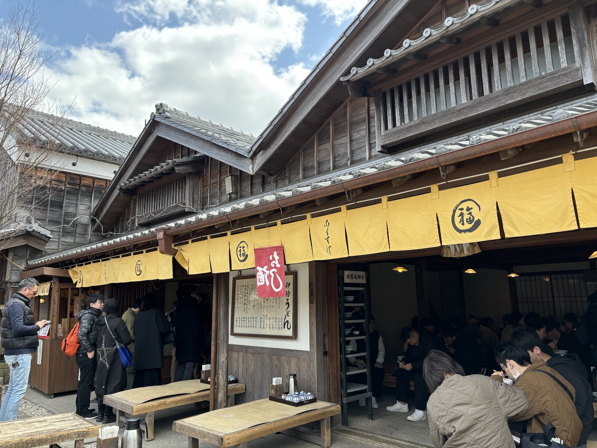 伊勢神宮内宮前にあるおかげ横丁で一際賑わう店。伊勢うどんの人気店で開店間も無く手打ちうどんは売り切れるほど。2番人気の伊勢うどんもツルッと柔らかい麺に甘めの醤油がかけられている。シンプルだけど美味い。また行列が出来ていても回転は早いです。