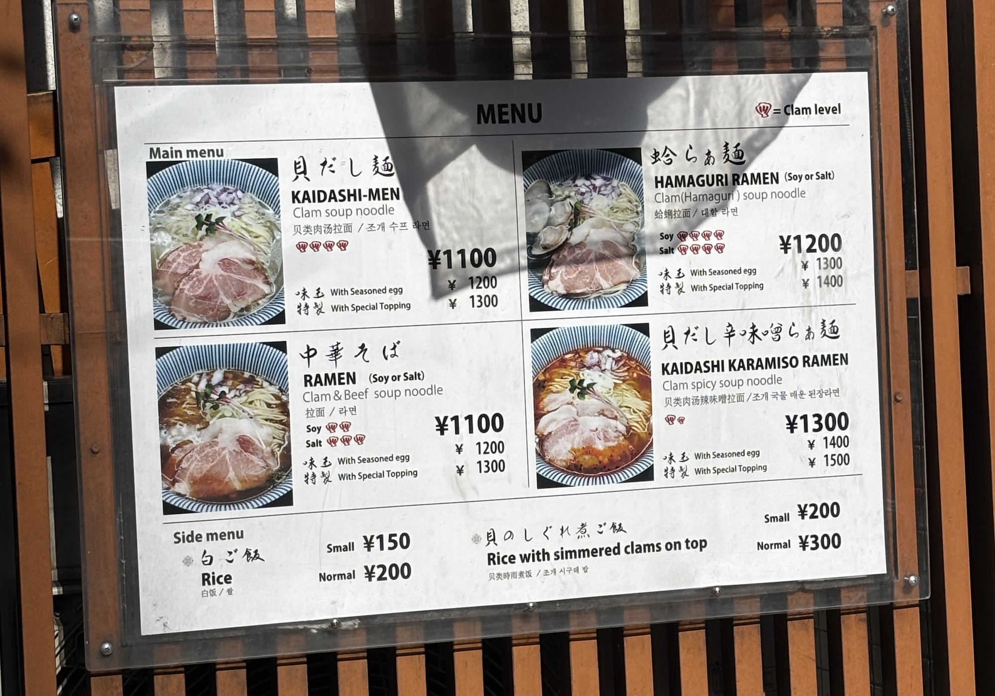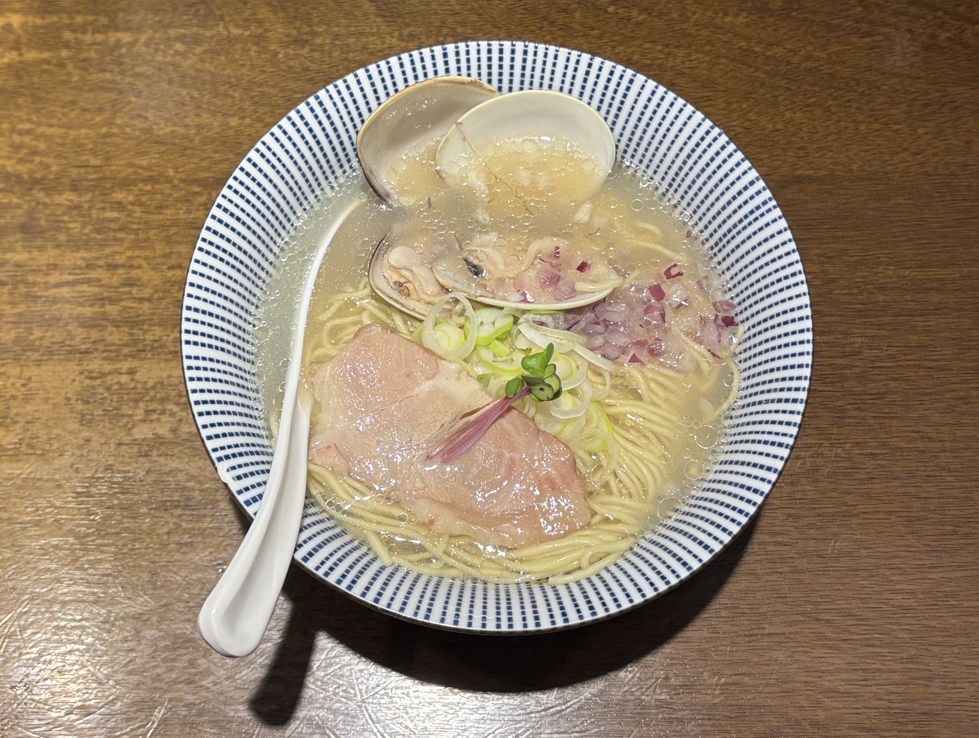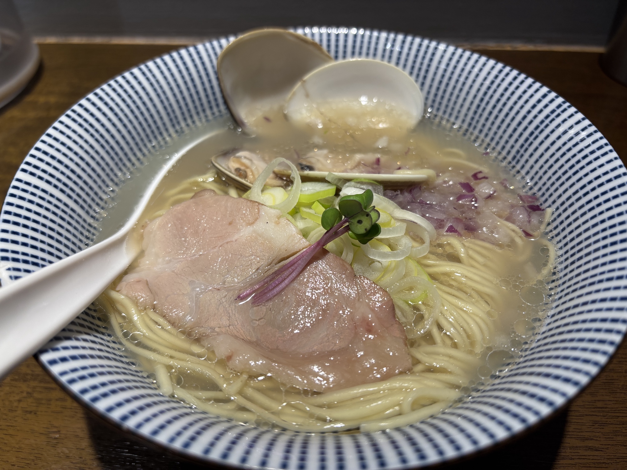 貝出汁麺をうたうだけあり貝出汁ラーメンと蛤ラーメンが人気のよう。三重県桑名市で食べた蛤ラーメンとは少し小ぶりながら蛤が2枚トッピングされ、くせのない細ストレート麺ともスープがよいマッチしていて美味しい。全体通じて上品な仕上がりでした。