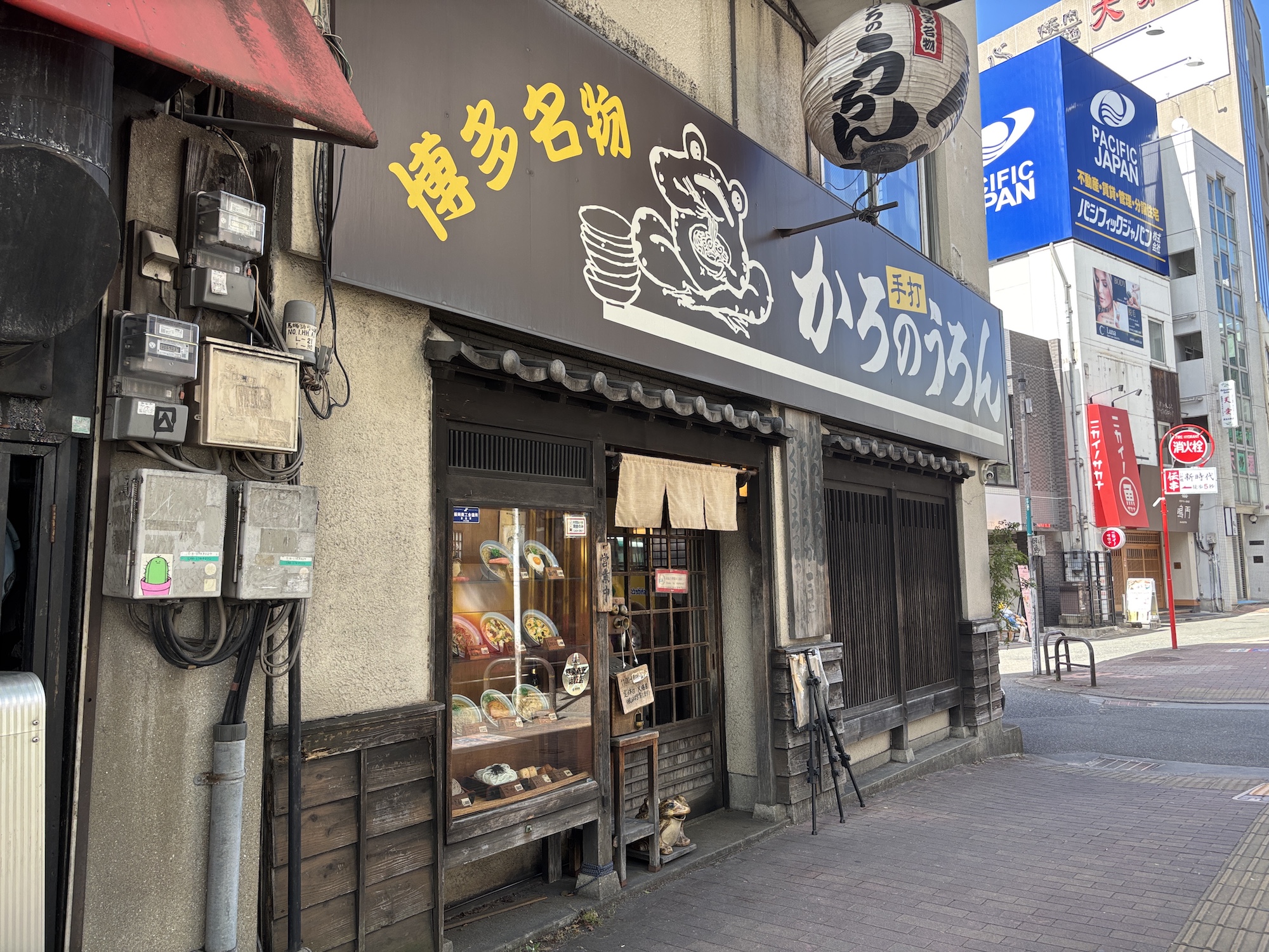 角のうどんが博多弁で訛って、かろのうろん。うどん好きからマスコミまでこぞって紹介し、全国的にも有名になった。店内やうどんも写真撮影禁止。店内に入ってテーブルにつく感も何度も言われ、逆に嫌な気持ちになってしまった。うどんはまあまあ美味いんだが、そのしつこい案内に冷めてしまった。
