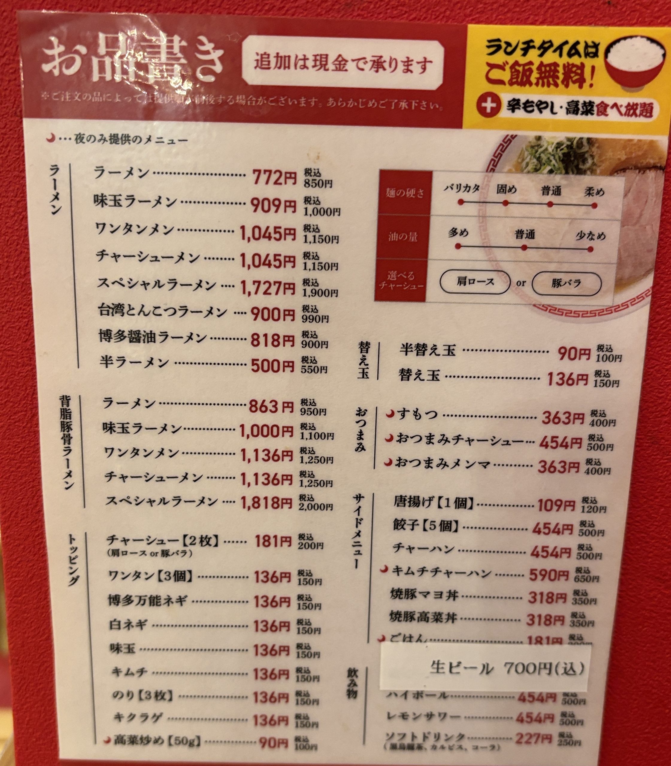 ラーメンは極細麺で博多ラーメンそのもの。麺の硬さはバリカタがちょうどいい。スープはニンニクが効いてるのかクセが強めだったけど、飲み進めるほどに慣れて行く。酢もつもありビールのおつまみ系も充実。