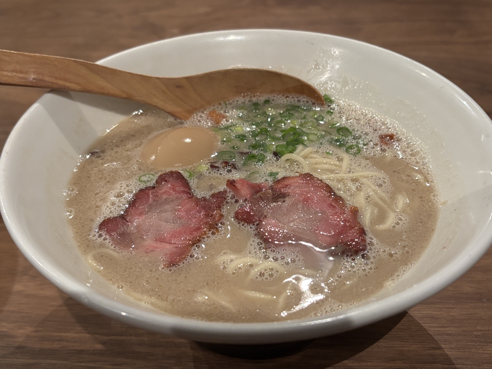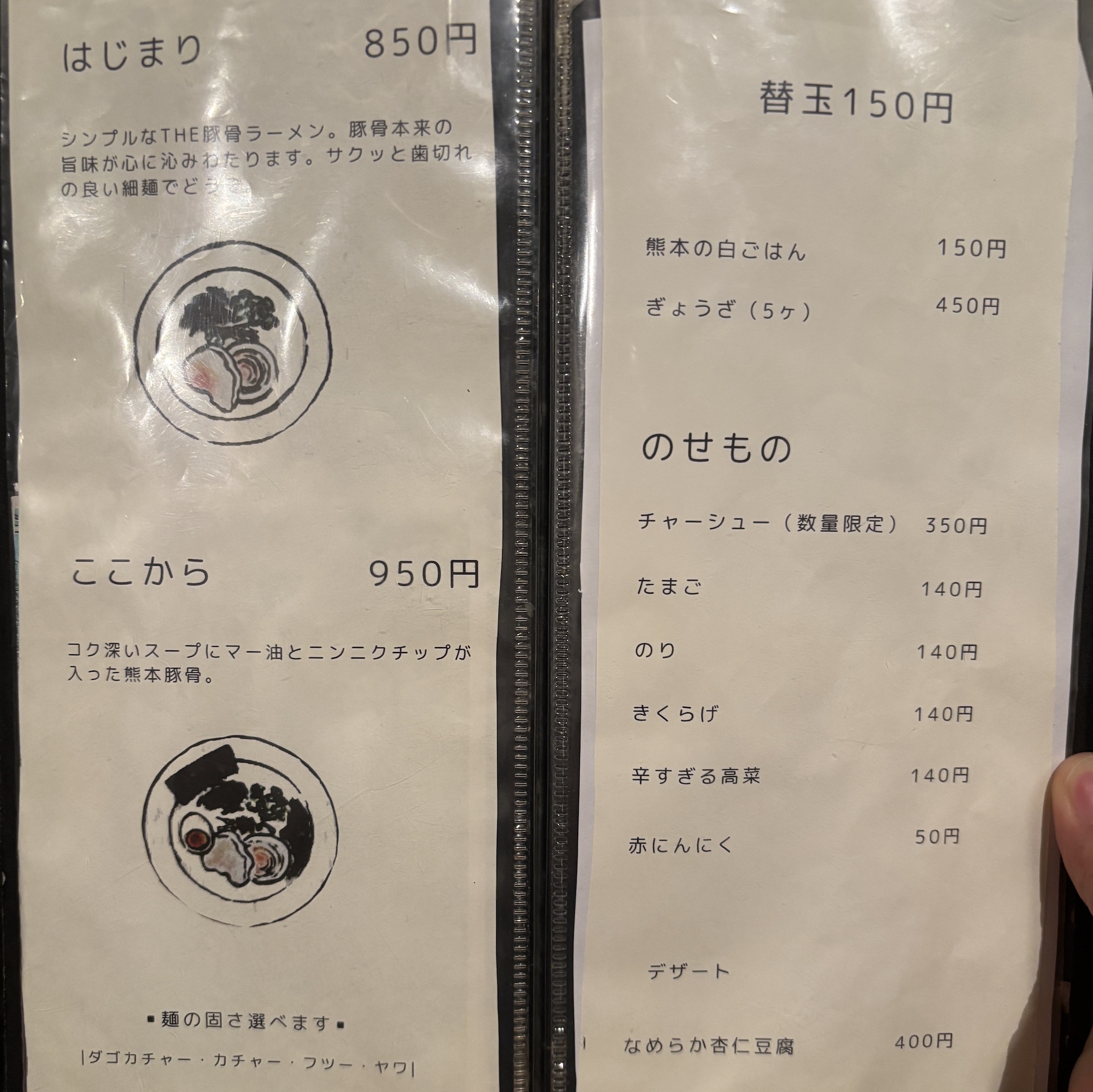 一風堂で修行をし独立。熊本新市街の路地裏に佇むラーメン店は見つけるのも至難の業。カウンターとテーブル席。メニューははじまり、ここからの2種類とトッピングのみ。はじまりは一風堂のような濃厚なストレート豚骨。ここからは熊本ラーメンに昇華したスタイル。期待を裏切らない店。