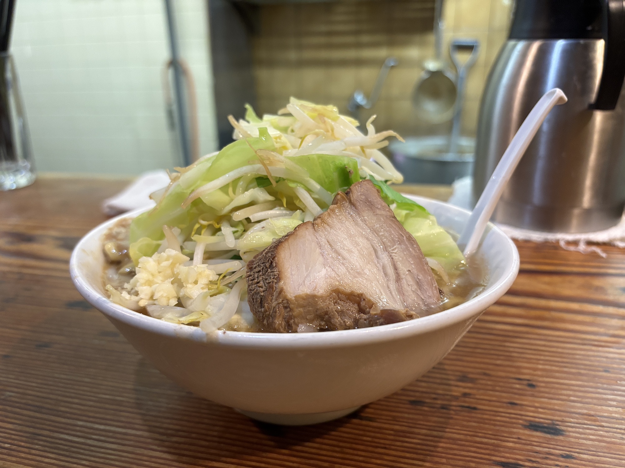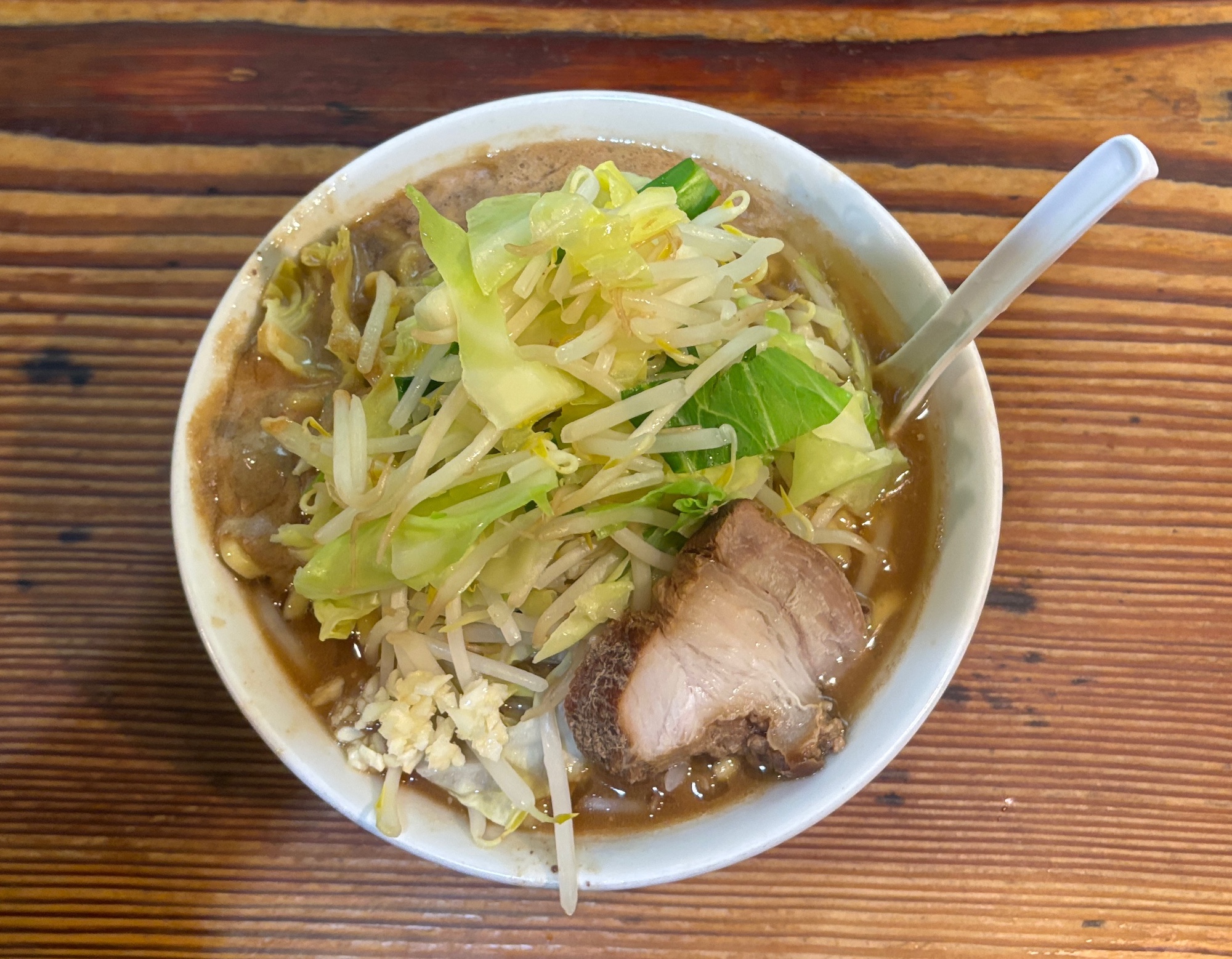 仕事帰りだったのでニンニク少々でオーダー。見た目もボリュームは二郎インスパイア系と変わらないが、ウェイブ状の極太ちぢれ麺はこれまで食べたことのない分厚い食感。スープも濁流というだけあり濃厚なスープで豚骨感が強め。麺と野菜の中間にたっぷり背脂もトッピングされている。