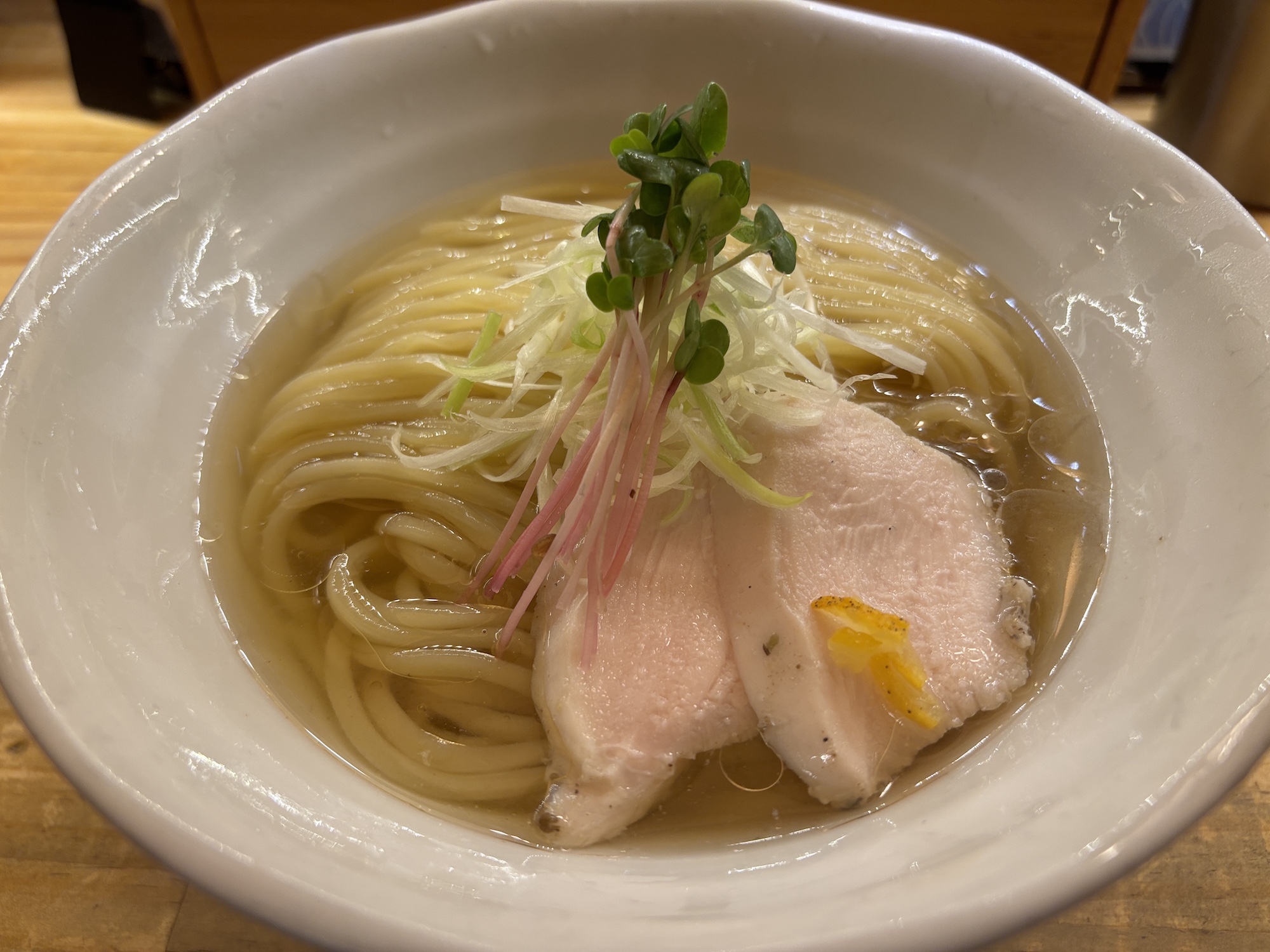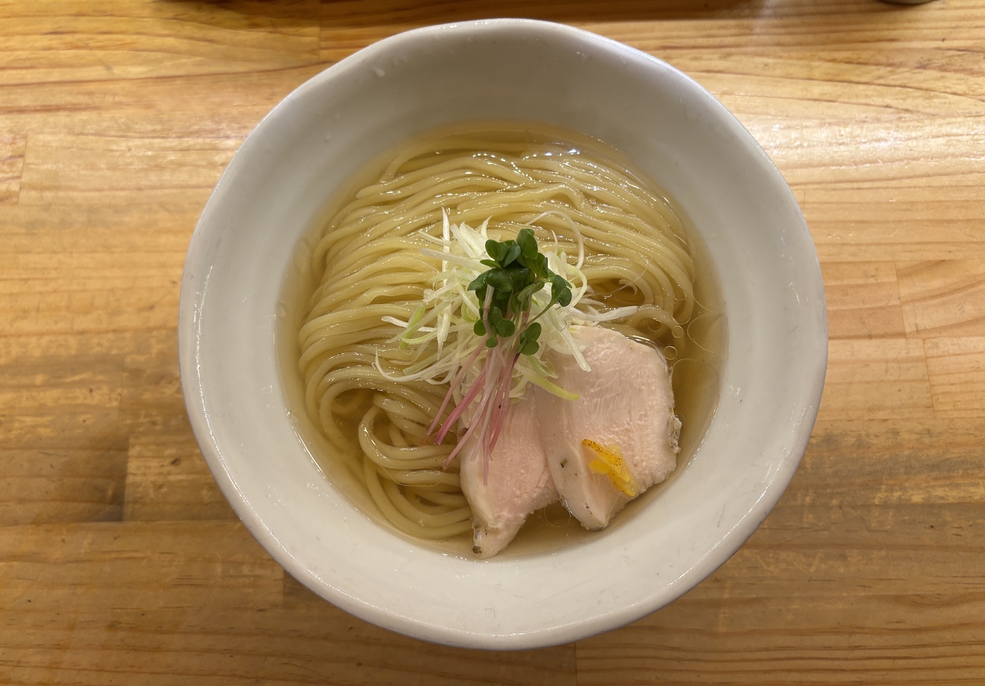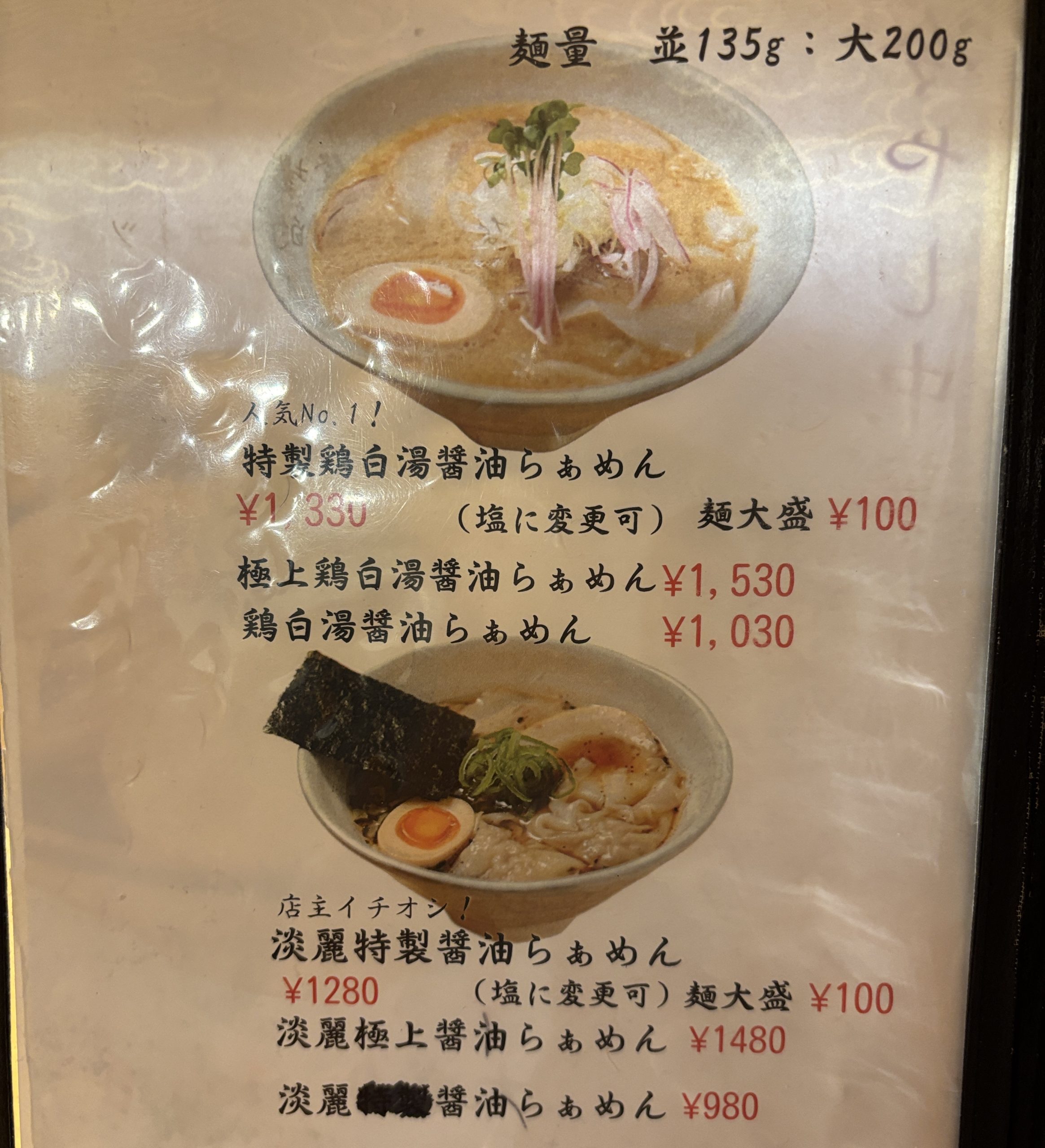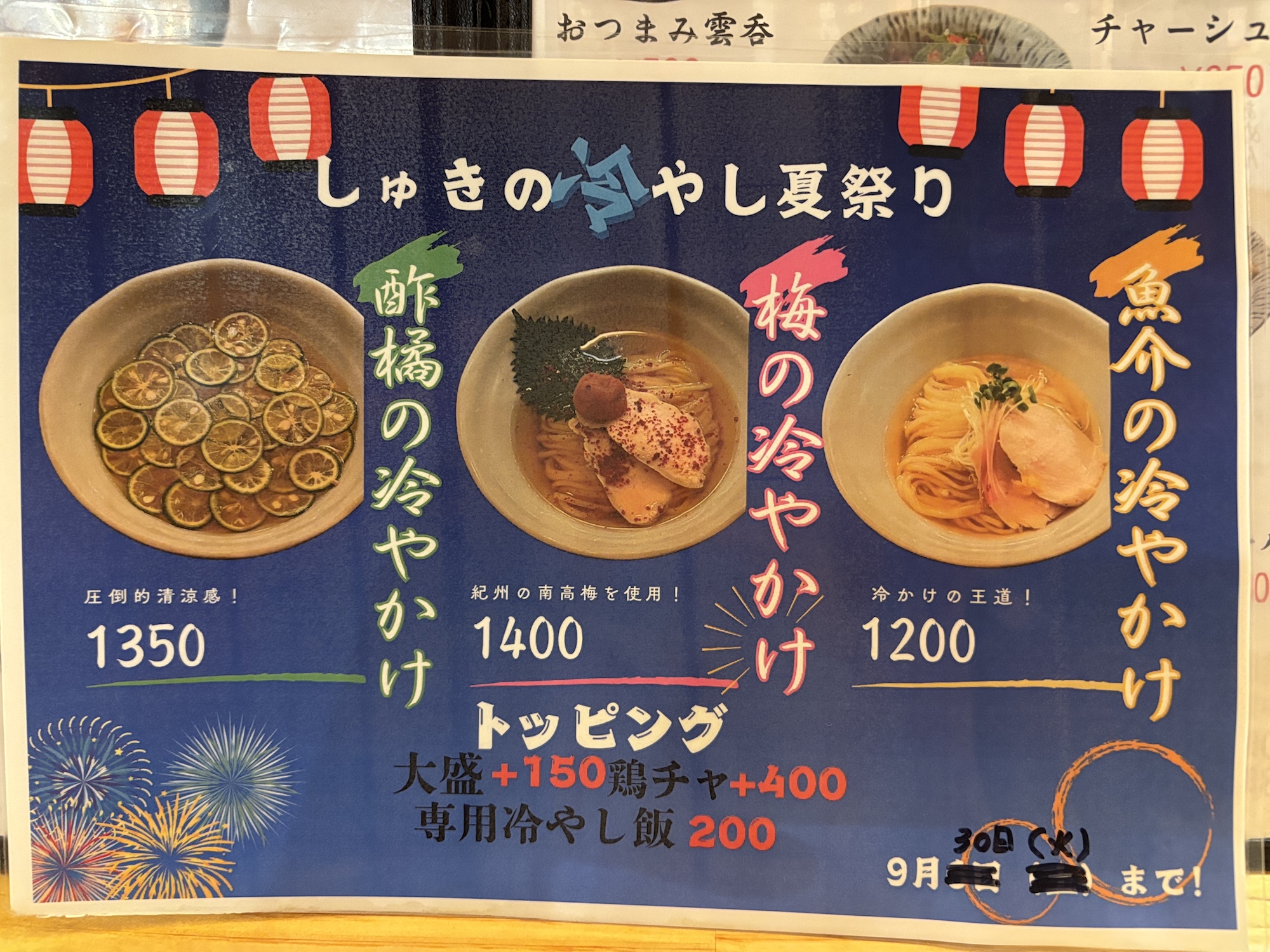 鶴橋駅に降り立つのは初めてでイメージは焼肉の町・商店街の雰囲気を楽しみながらぶらぶらしていたらお腹も空いて調べて見つけた。鶏白湯と清湯醤油の二枚看板かな。たまたま行列もなく入れた。夏限定の冷かけをいただく。太麺は弾力強めのもちもちしていた。魚介スープも美味かった。