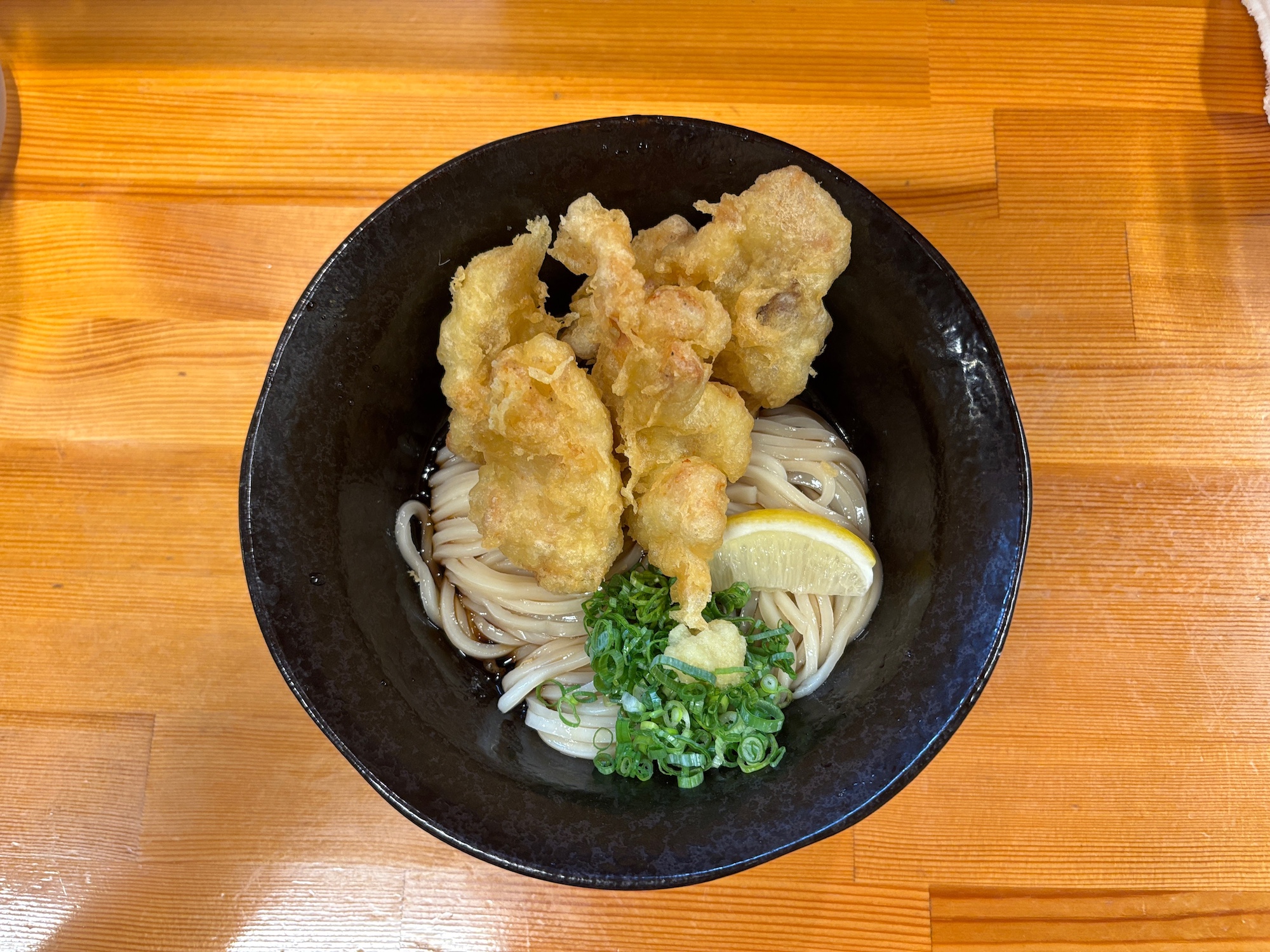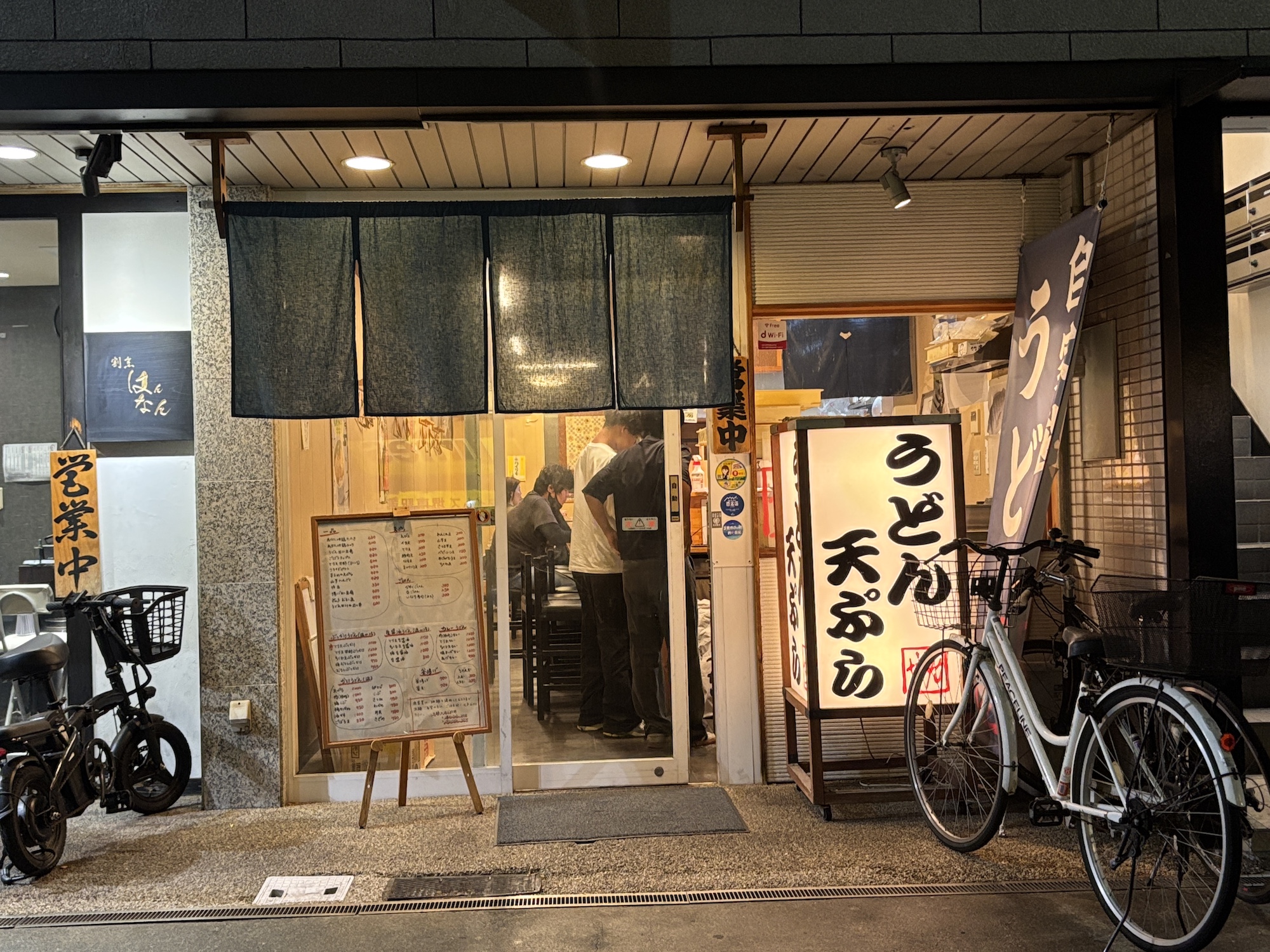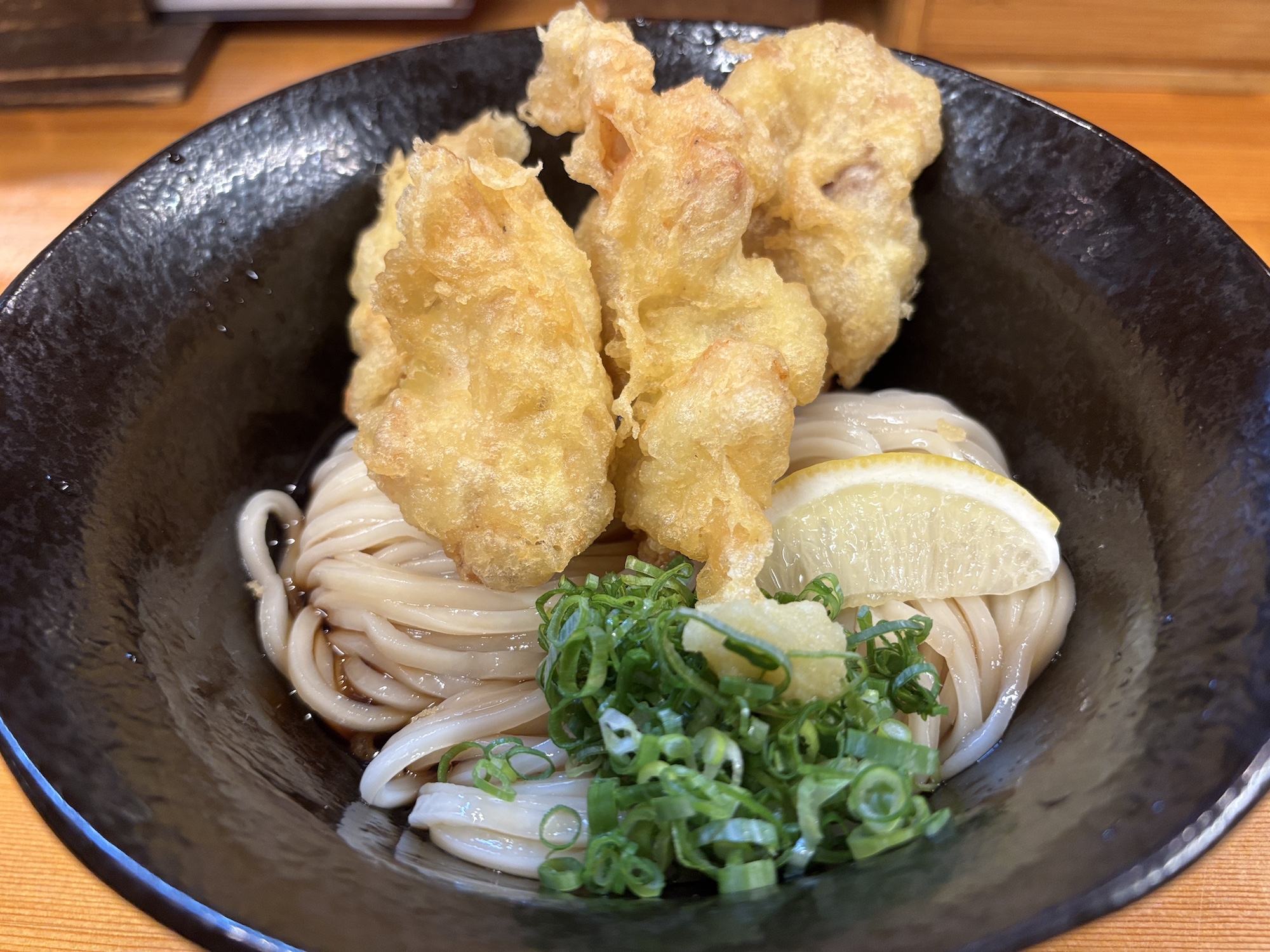 堺東駅前の商店街から少し離れた場所にある名店。自家製の細麺、太麺を用意していて、1番人気の鶏天ぶっかけをいただいた。衣はサクサクしていてもも肉は柔らかくジューシー。麺もコシが強く弾力がある。夜は居酒屋スタイルでメニューも充実している。
