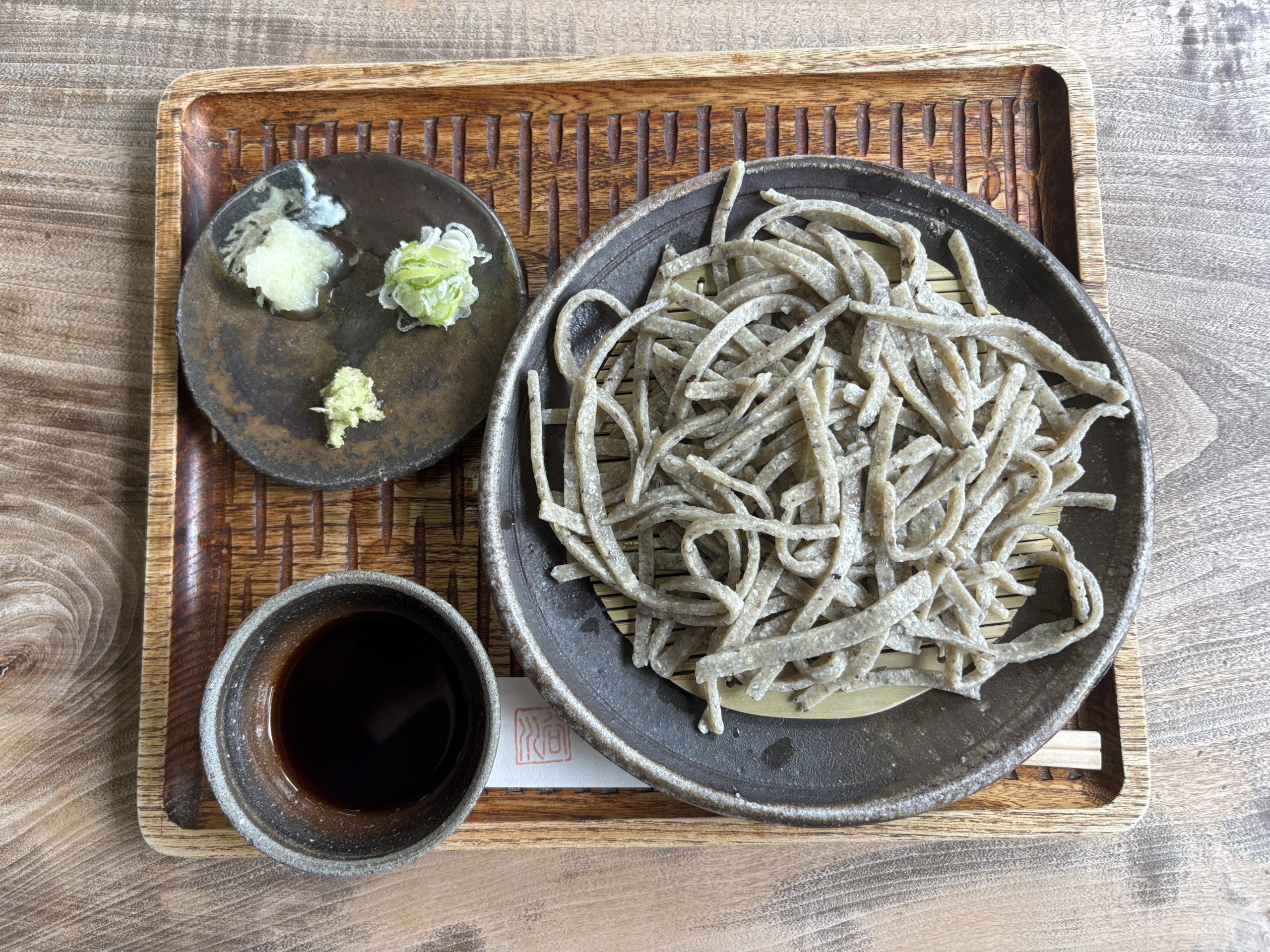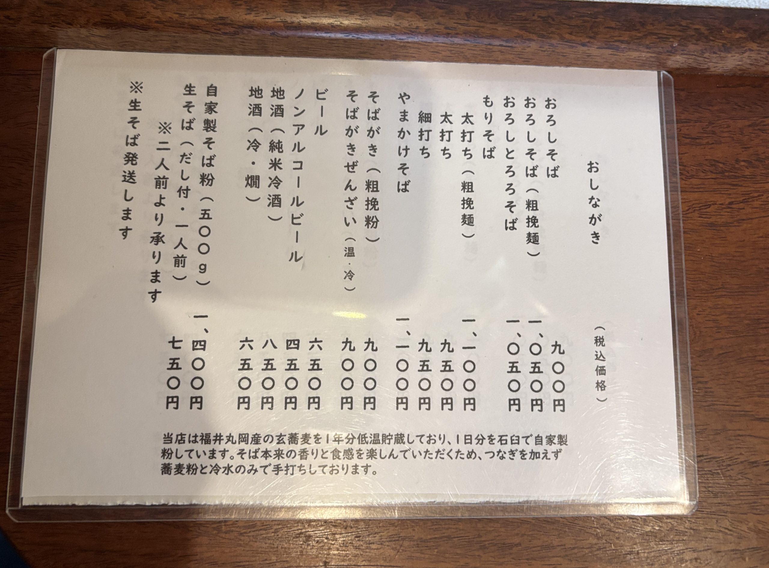 福井鉄道の北府駅かたけふ新駅でおり歩いて住宅街に向かうと大きな屋敷が。開店前から列が伸び始めていく。記帳または店員さんに名前と人数を告げて待つと順番に案内される。座敷にあがるとテーブルが並んでいて、大きな窓から庭が見える。毎日石臼で挽くそばを粗挽きで注文をし、もりそばをいただく。そば茶から始まり、そば湯もついてそばが提供される。つなぎを使わないそばの粗挽きは、そばそのものの風味と弾力を体験できる。そば湯も濃厚でつばつゆで一杯。二杯目はそば湯だけで飲んでも美味しい。