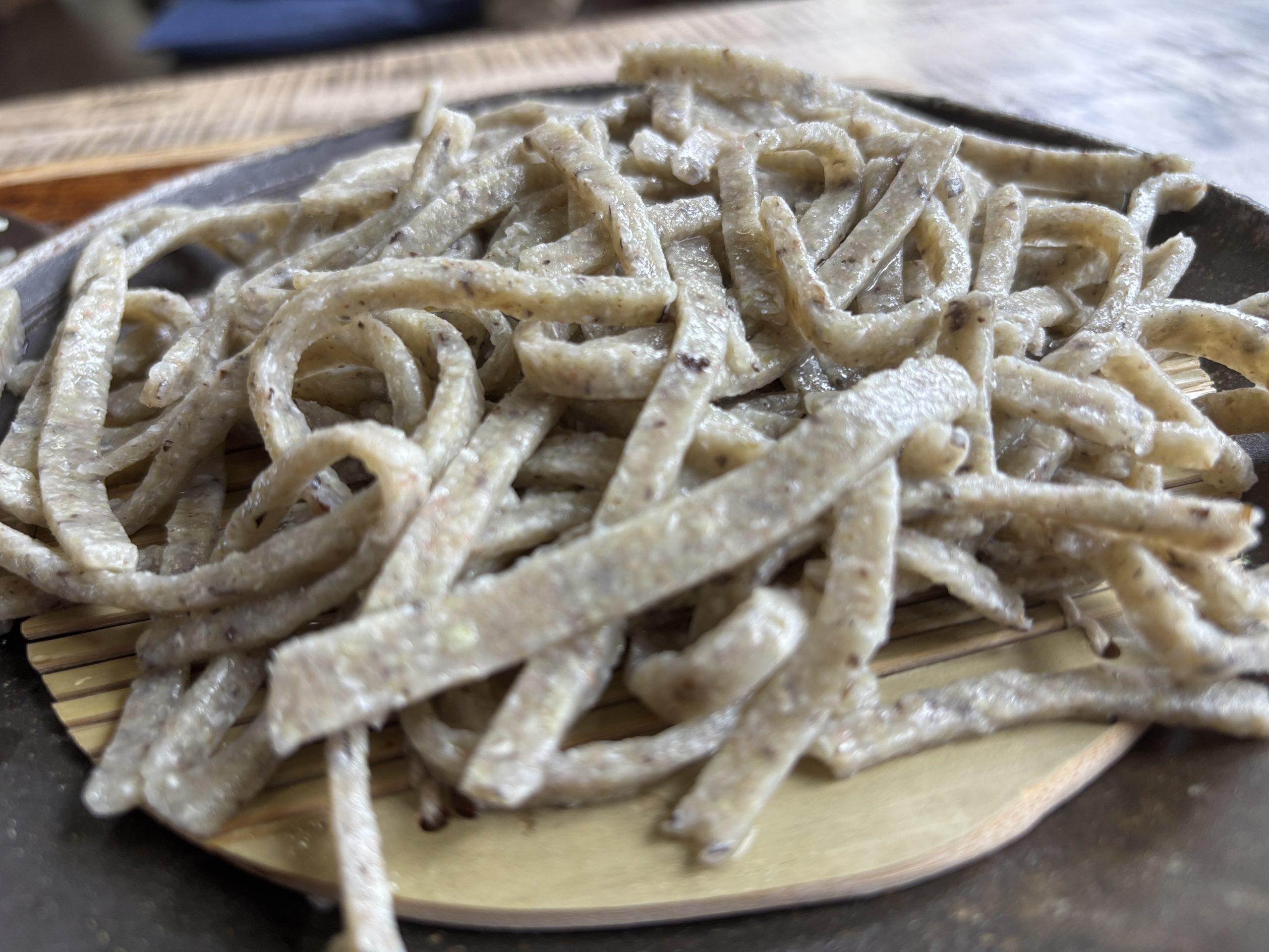 福井鉄道の北府駅かたけふ新駅でおり歩いて住宅街に向かうと大きな屋敷が。開店前から列が伸び始めていく。記帳または店員さんに名前と人数を告げて待つと順番に案内される。座敷にあがるとテーブルが並んでいて、大きな窓から庭が見える。毎日石臼で挽くそばを粗挽きで注文をし、もりそばをいただく。そば茶から始まり、そば湯もついてそばが提供される。つなぎを使わないそばの粗挽きは、そばそのものの風味と弾力を体験できる。そば湯も濃厚でつばつゆで一杯。二杯目はそば湯だけで飲んでも美味しい。