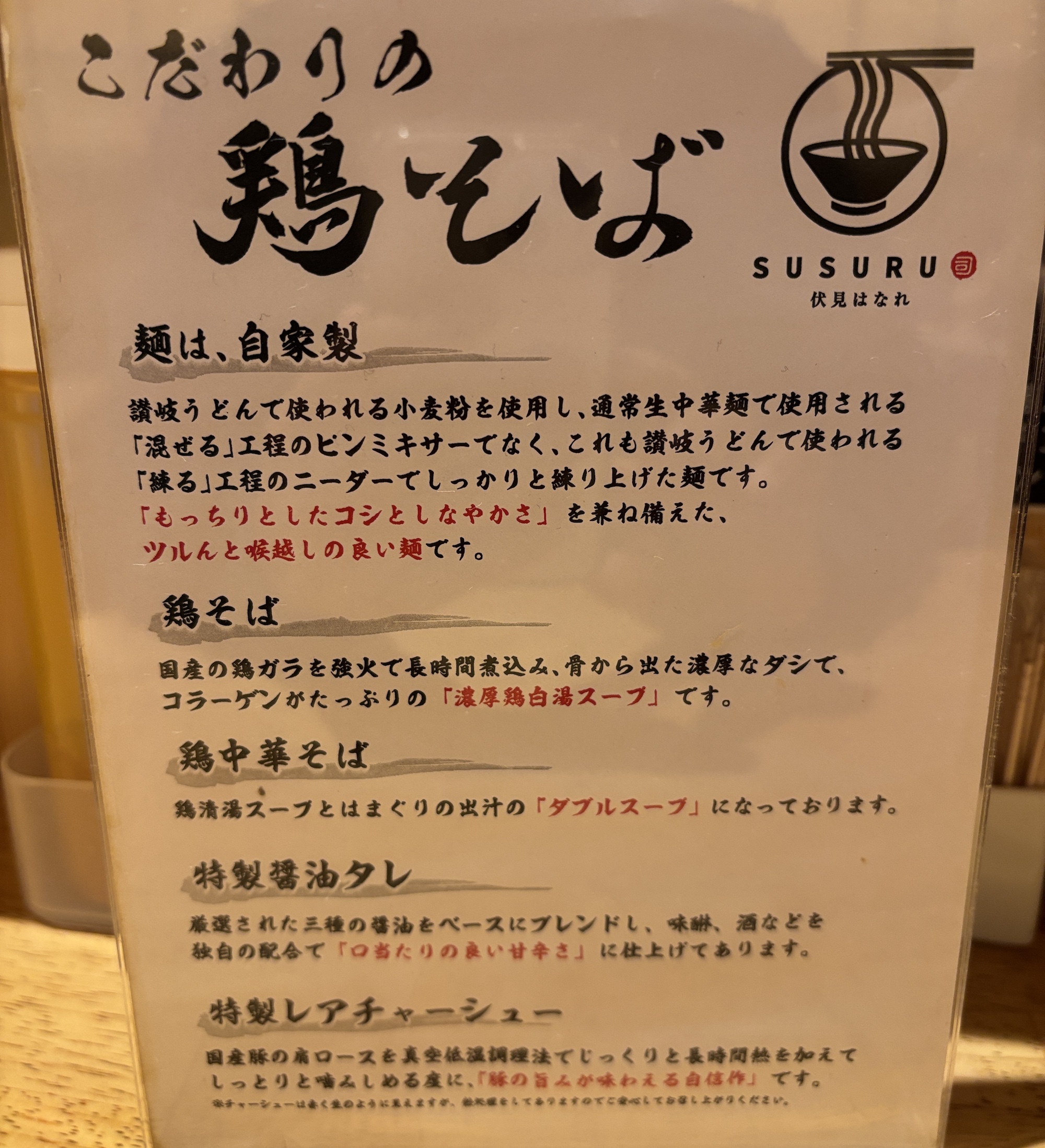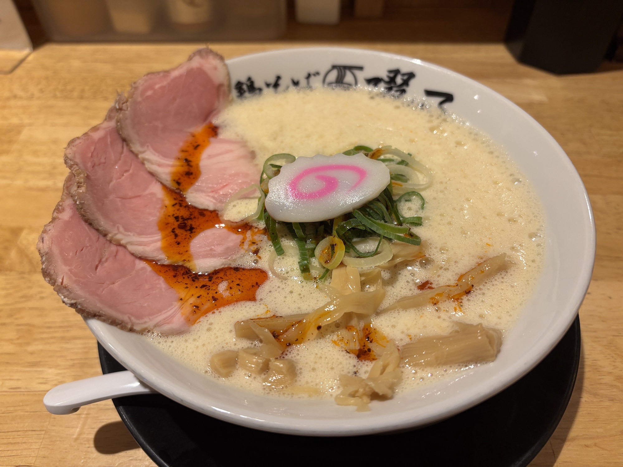 伏見駅近くのビルの地下にある鶏白湯専門店。愛知県内では勢力拡大している。鶏ガラを煮込んだスープを泡立たせるエスプーマ系ラーメン。低温真空調理したレアチャーシューも添えてある。自家製のちぢれ細麺ともよくスープが並んでよかった。