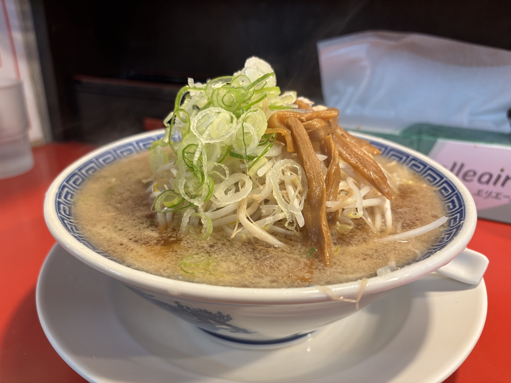 もやし山盛りがデフォルトの二郎系をイメージするが、全体的にはあっさりしたスープにくせのない細いストレート麺で、朝でも余裕で食べれてしまう。それでいて、もやしも麺も量が多いので満足度も高い。