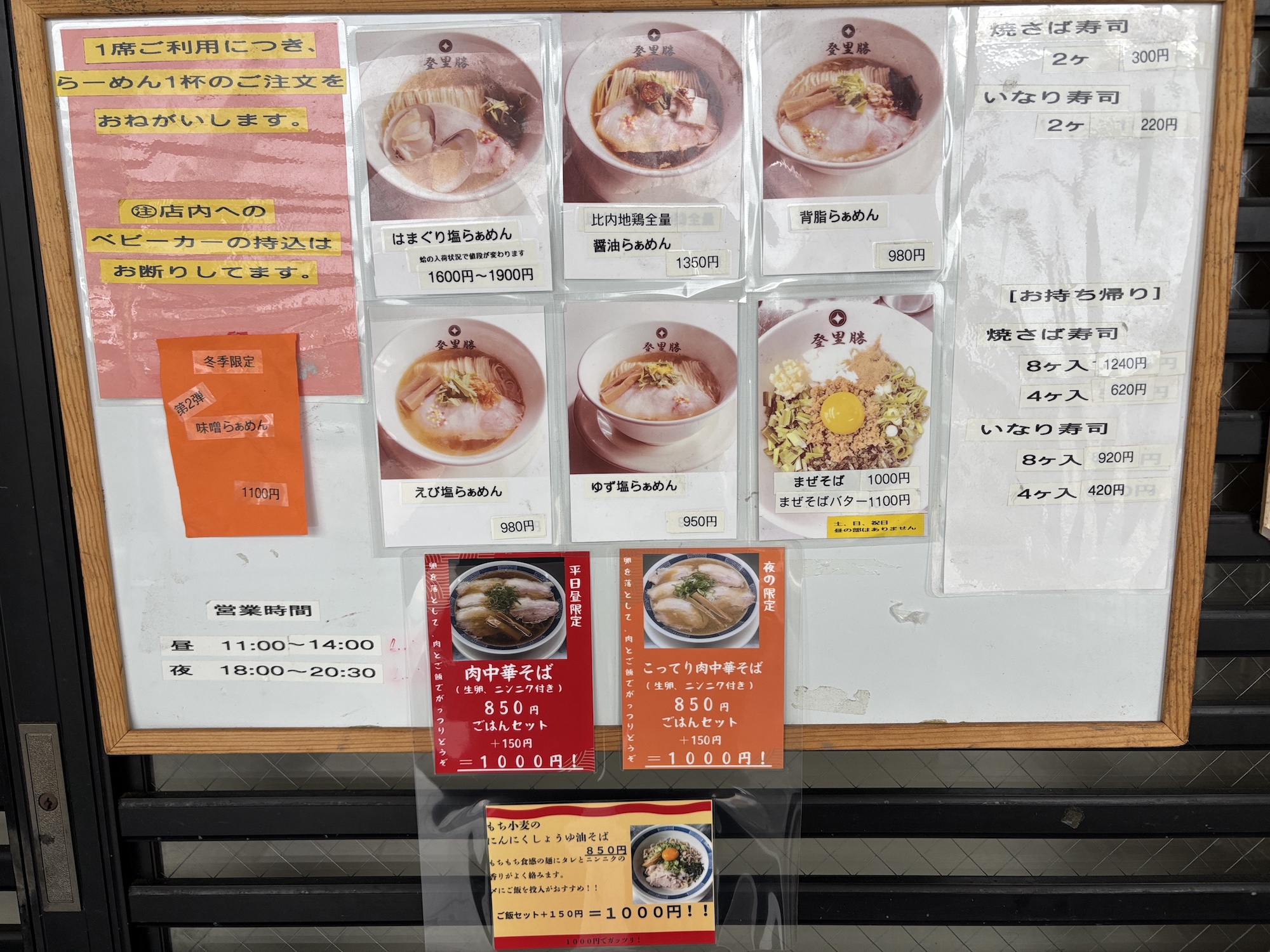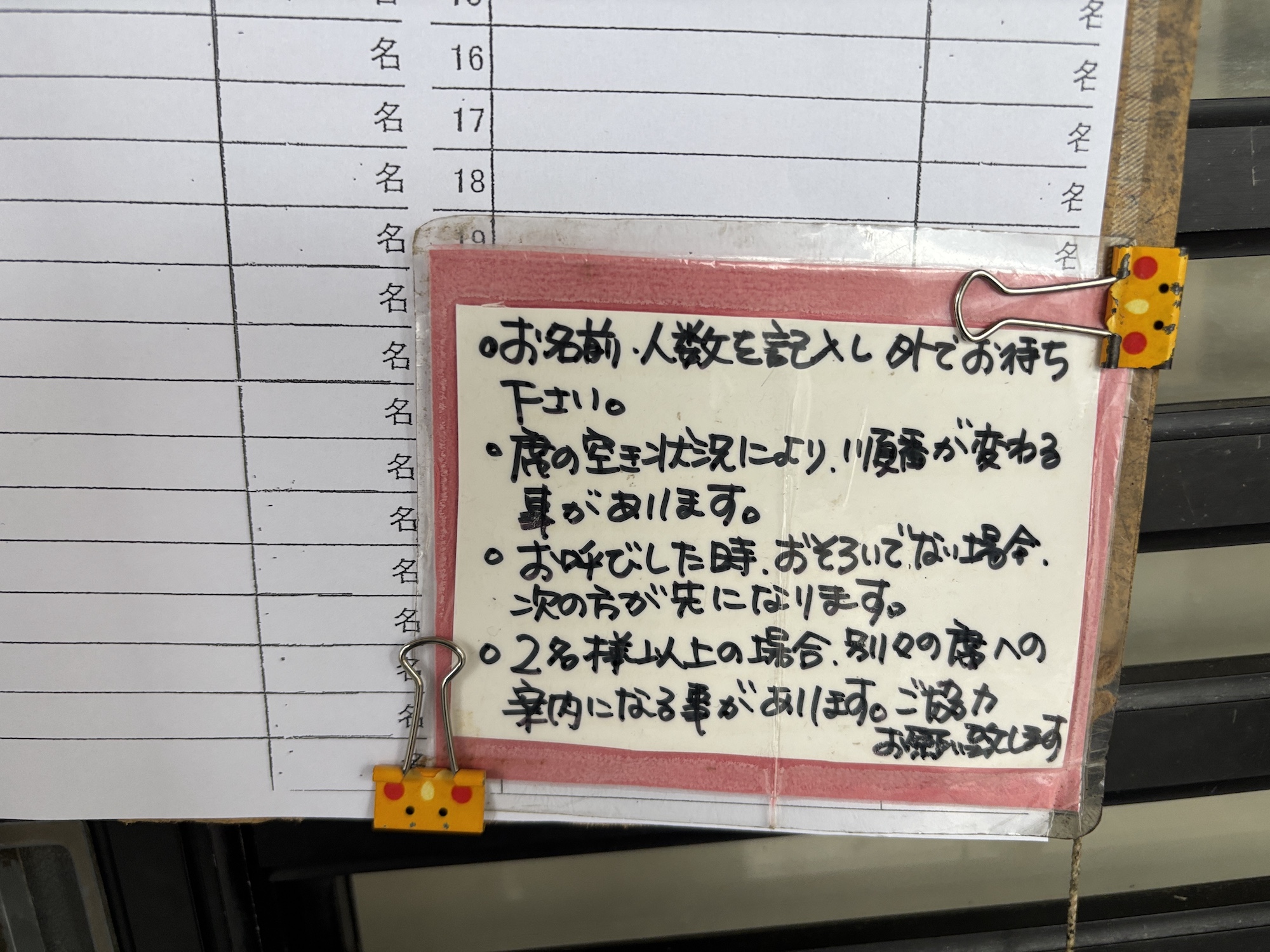 外観や内装は寿司屋時代のままで、焼き鯖寿司も提供しているので酢飯の香りがします。開店前30分前につき記帳台に名前を書いて待機。開店までに十数人いた。はまぐりの仕入れ状況で値段が多少変わるそうで、一般的なラーメンより高めの金額。