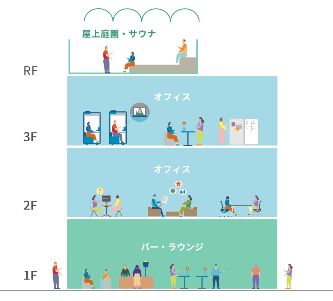 (3)ウェルビーイング・リフレッシュ機能:心身が“ととのう”、質が高まる 施設内には、心身のリフレッシュや健康的な働き方を支える空間を整備します。屋上に は、外気を感じながら“ととのう”ことができるサウナ等のリフレッシュ機能やテラスを 設け、業務の合間や終業後にリセットできる環境を用意します。“働く時間”だけでな く、生活そのものの質を高めることで、良い仕事と良いつながりを生み出します。