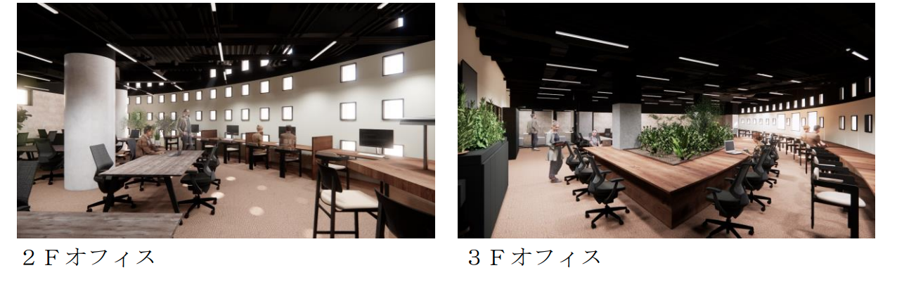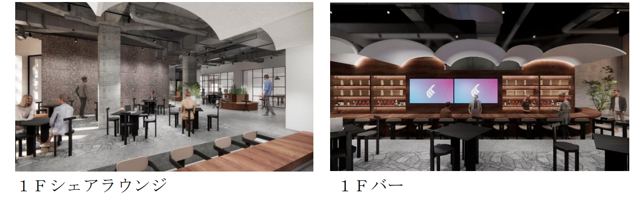 (2)交流機能:社内外がゆるやかに“つながる”シェアラウンジ 施設の一部には、社員同士のコミュニケーションに加え、社外とのゆるやかな交流が生 まれる場を設けます。1階には、飲食用途で活用されてきたバーカウンターを再利用し、 日中はカフェ、夕方以降はバーとしても活用できる空間を整備します。打合せ・休憩・イ ベント時の交流拠点として、仕事と日常、社内と社外が自然につながる場を目指します。 ここから、地域の課題やニーズを捉え、外部企業・大学・スタートアップ等とも連携し た共創を育てていきます。