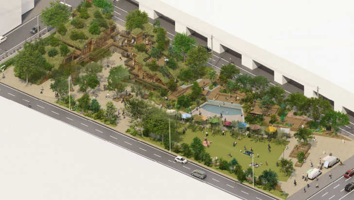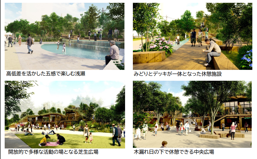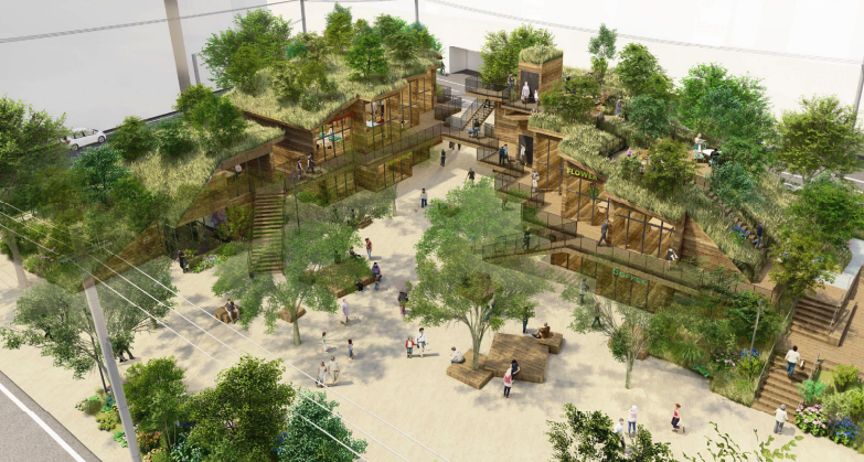 ①ひとつなぎの森︓公園と建築が連続した都市と⾃然が溶け合う⾵景を創出