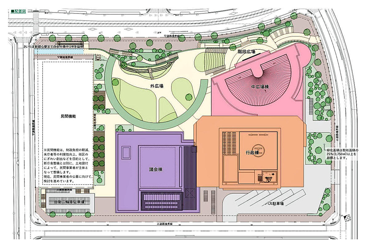 ◆ 敷地面積-約15,000㎡(新庁舎敷地)、約2,300㎡(民間機能敷地)